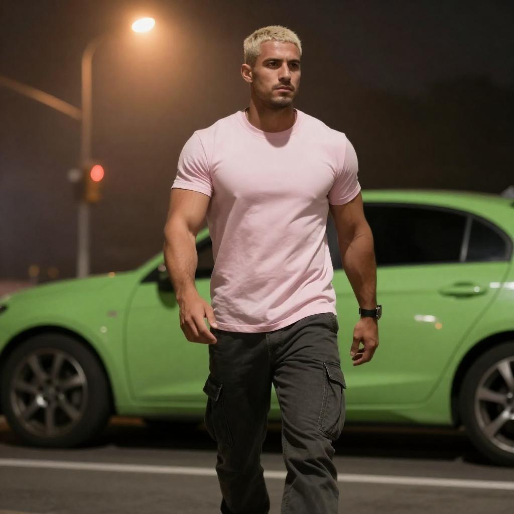 Photograph of a muscular man with short blonde hair, wearing a light pink graphic t-shirt and dark cargo pants, walking at night. He is in front of a bright green car under an orange streetlight, with fog in the background. The street has a crosswalk and a traffic light.