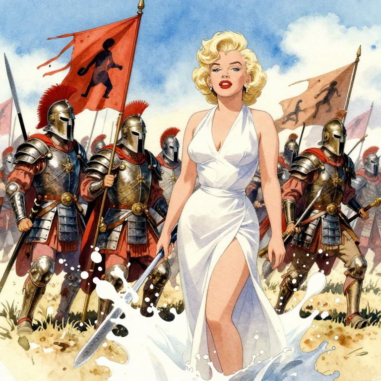 "Marilyn Monroe splash, in the distance, fearless spartan warriors in detailed intricate armor, marching into battle, battlefield, carrying banners of war, watercolor style, Miyazaki style,"