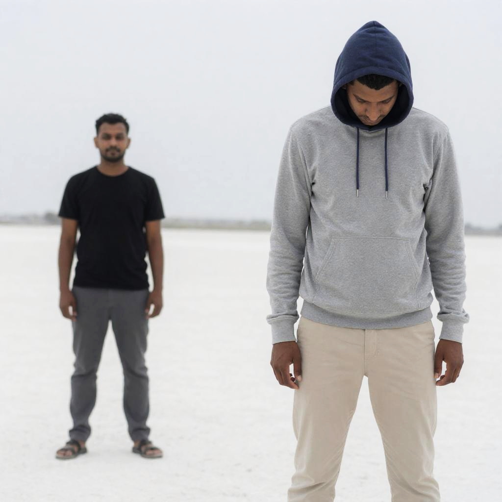 Two men on a dark, rain-slicked rural road at night. One stands facing the other, wearing a white sweater and black pants, hands in pockets. The other, facing away, wears a gray hoodie and dark pants. Grass and trees on both sides. Streetlight casts a glow. Blue boat on the right.