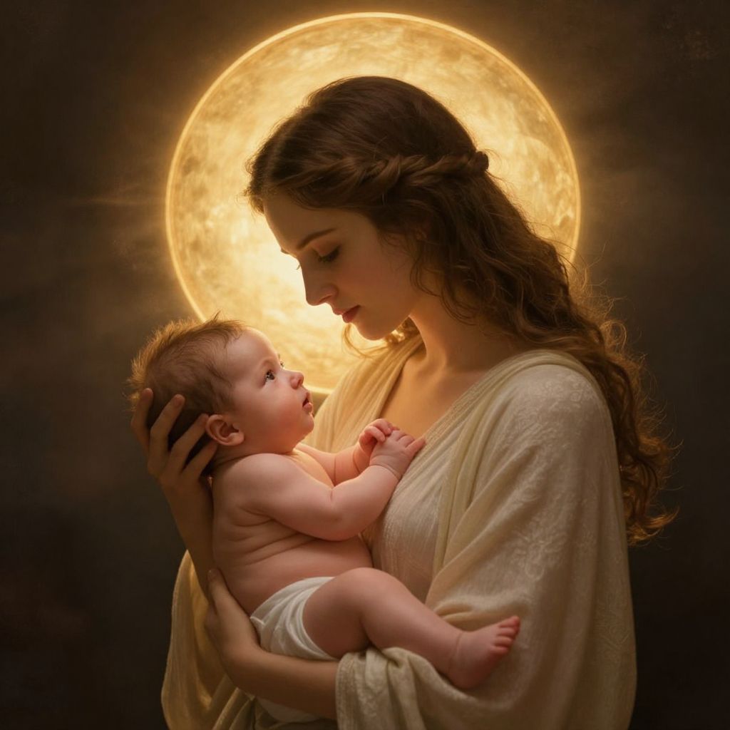Radiant woman cradles a serene infant, enveloped in a golden halo against a dark backdrop, symbolizing divine purity and maternal love.