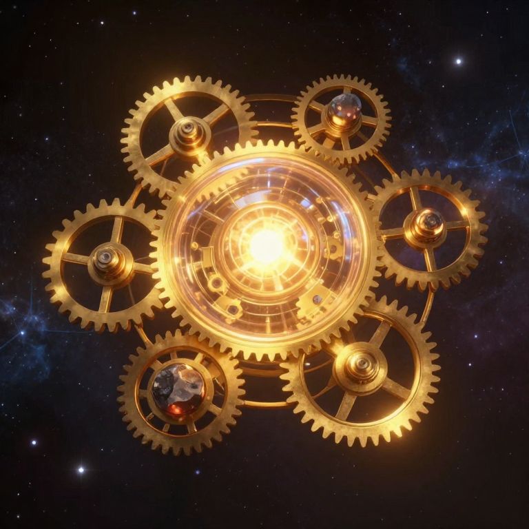 Gears intricately interlocked in golden hues revolve around a central luminescent orb, surrounded by four smaller glowing stones, set against a star-studded cosmic backdrop, evoking the forgotten mechanics of an ancient celestial machine.