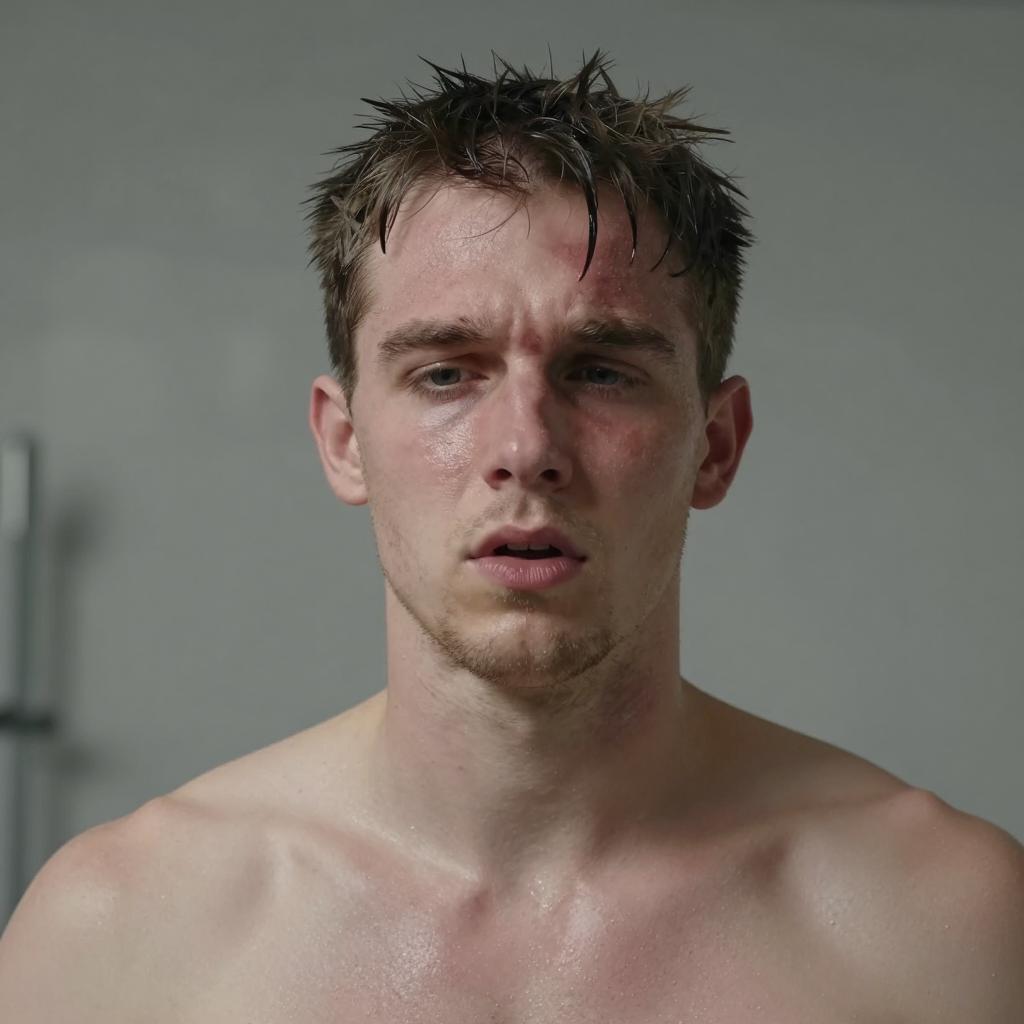 Man with wet, dark hair, medium build, shirtless, in a green-tiled shower. Holding a white cloth near his chest, looking intently to the side. Water droplets on his skin. Glass shower door in the foreground.