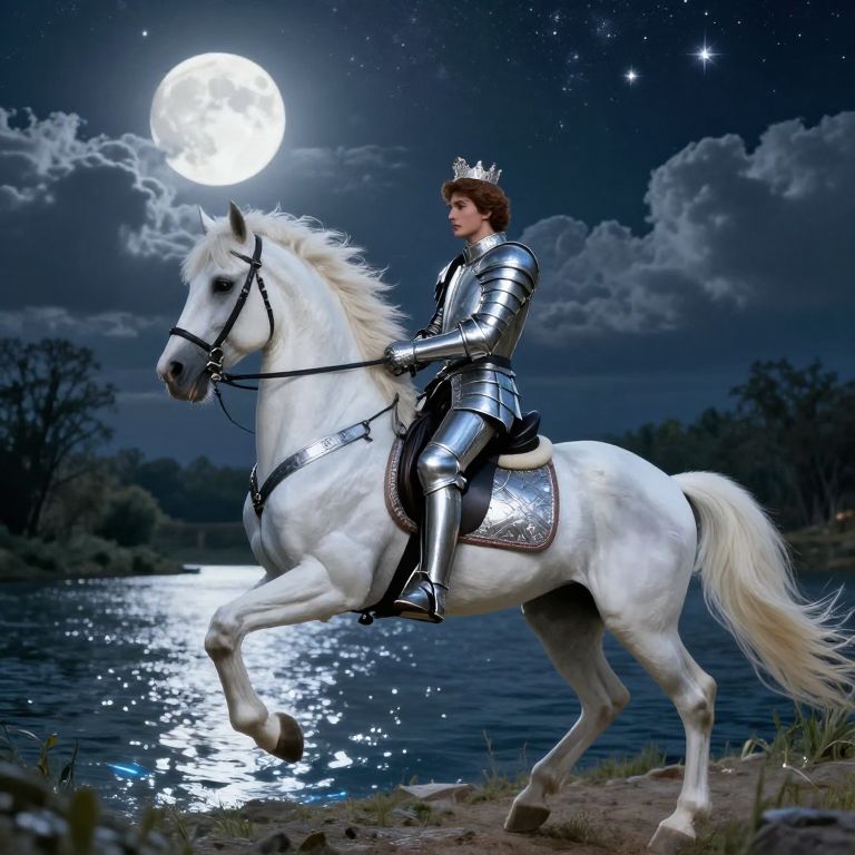 Knight in silver armor with crown, riding white horse, under full moon, over shimmering lake, night sky with stars and clouds. Photographic realism