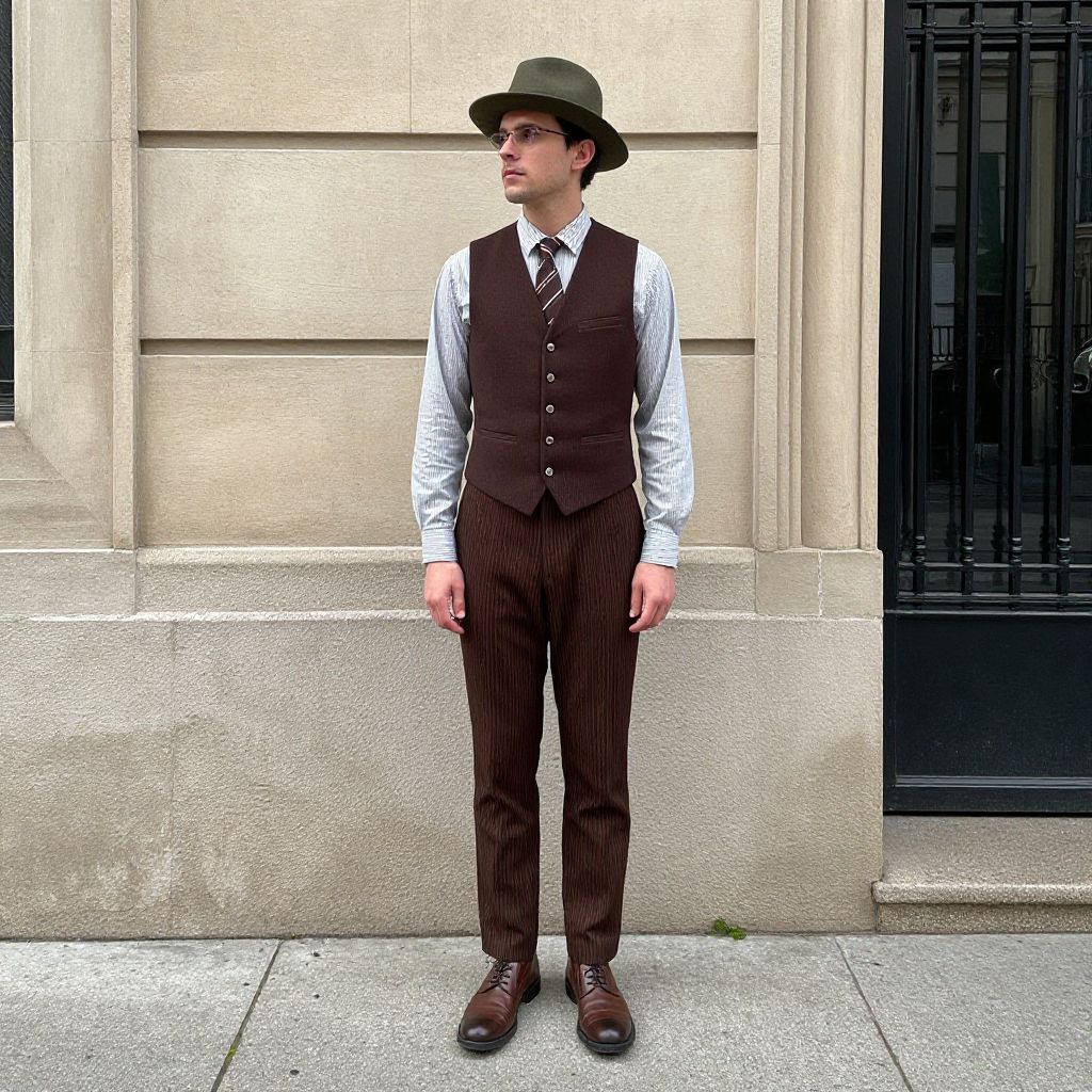 Retro Style Outfit Male Costume, man in a hat and vest standing on a sidewalk