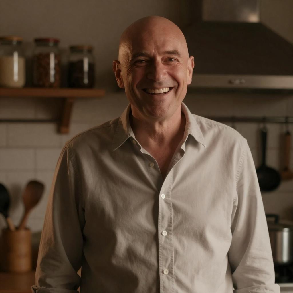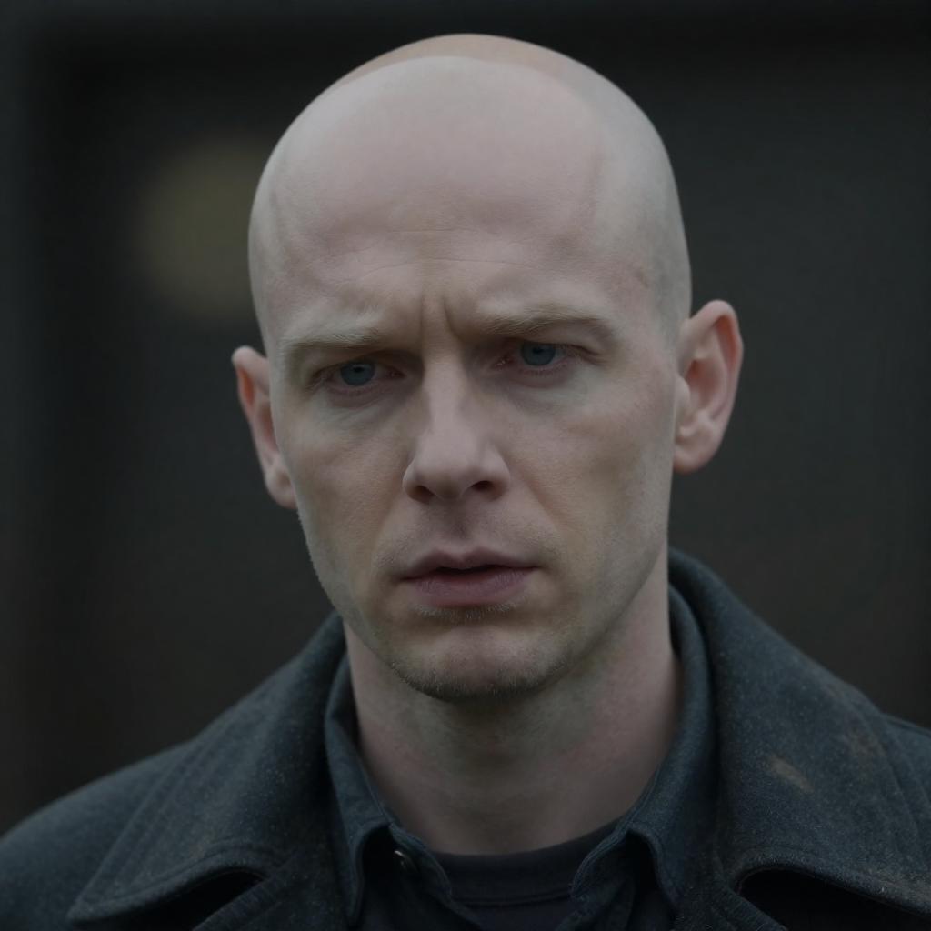 Close-up of a bald, middle-aged man with a surprised expression, eyes looking upward, mouth slightly open. Wearing a brown scarf. Background has red vertical lights and a gray metallic wall. Man's skin is pale, face shows wrinkles.