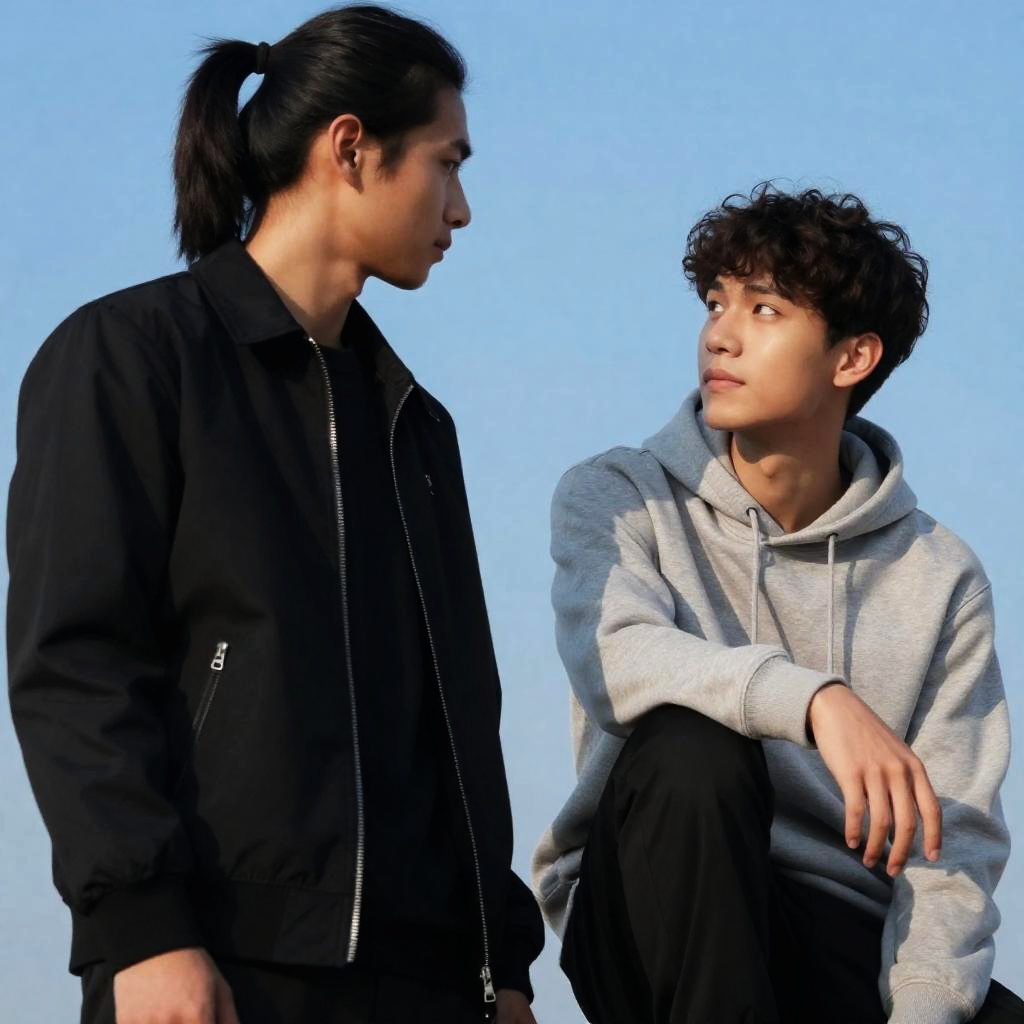 Two young Asian men standing on a balcony at night, illuminated by bright red neon lights forming futuristic geometric shapes. One man wears a white t-shirt with a white jacket, and the other wears a white t-shirt paired with a light blue button-up shirt. Both have short black hair and neutral expressions, looking slightly to the left. City lights are softly visible in the background.