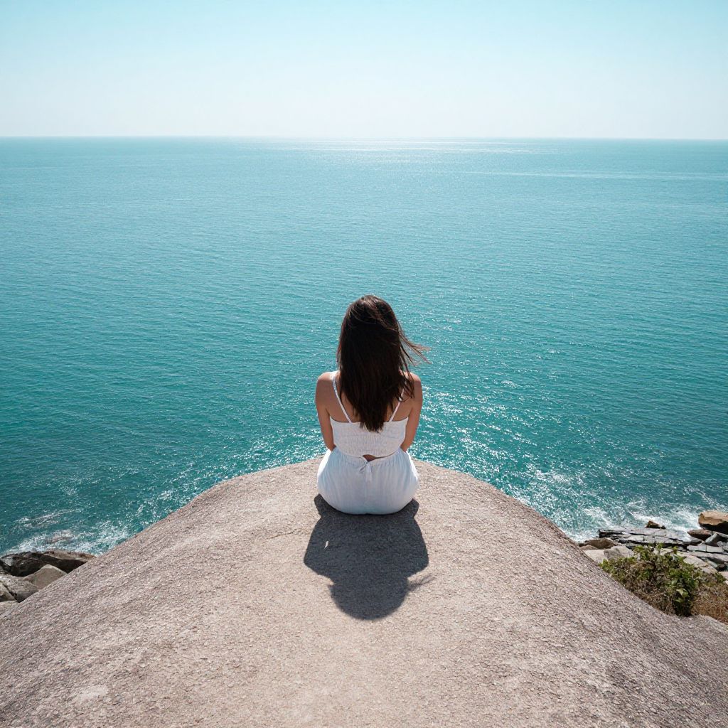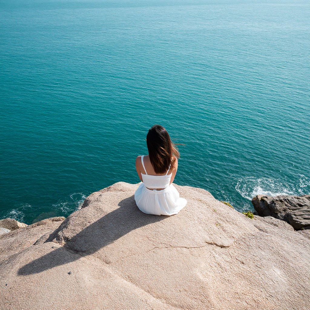 Embracing the boundless horizon, a woman sits serenely atop a rocky perch, her spirit mirrored in the turquoise embrace of the sea, where freedom whispers through the salty breeze and the eternal dance of light and shadow invites introspection.