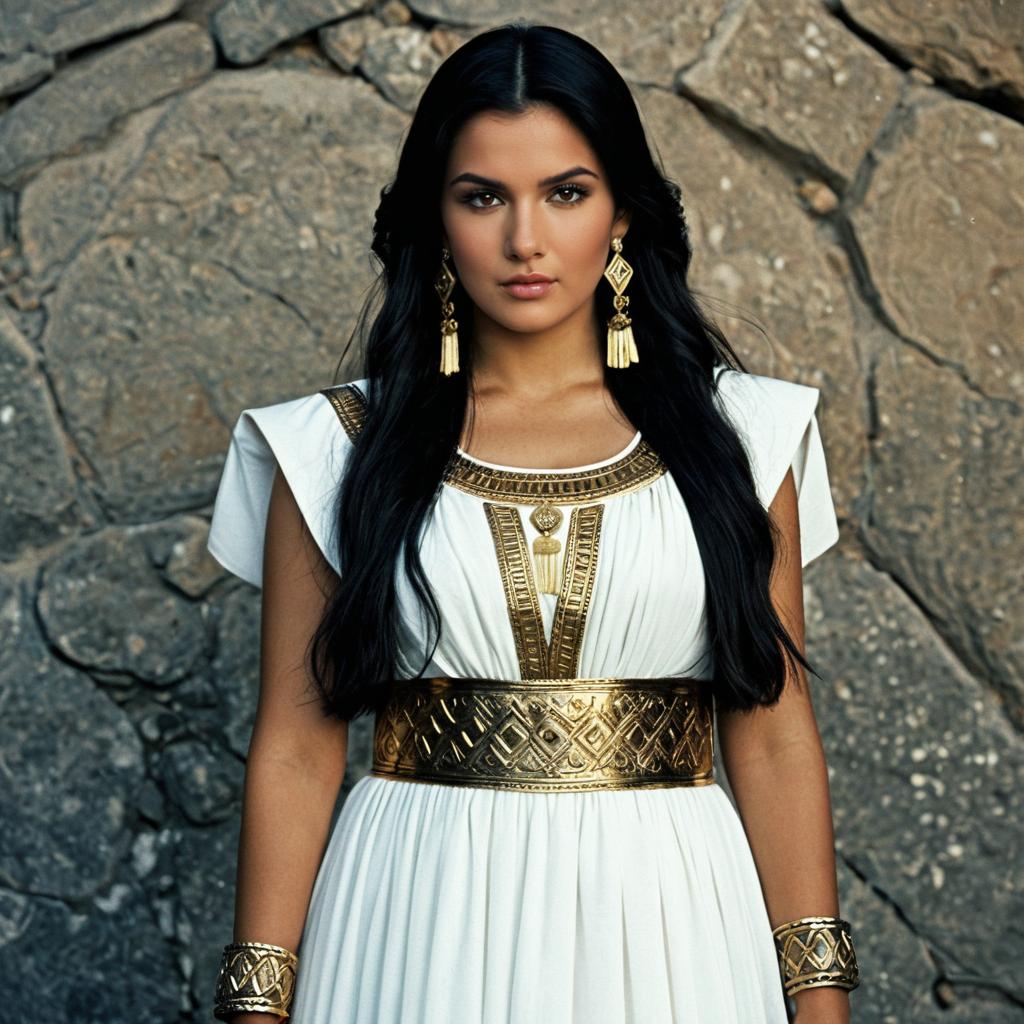 Portrait of a young woman with long black hair wearing a white Greek general costume featuring gold decorative elements including a wide belt, bracelets, and tassel earrings, standing against a textured stone wall background. The outfit is styled with intricate metallic gold jewelry, giving a realistic historical appearance.