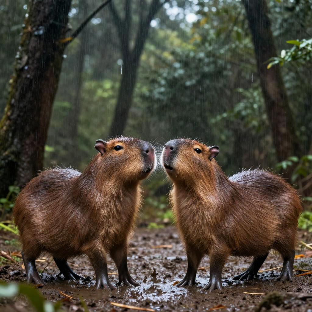 Capybara fighting with another rodent at dusk near a tranquil riverbank, water reflecting the fiery sky, dynamic movement captured in a cinematic, painterly style