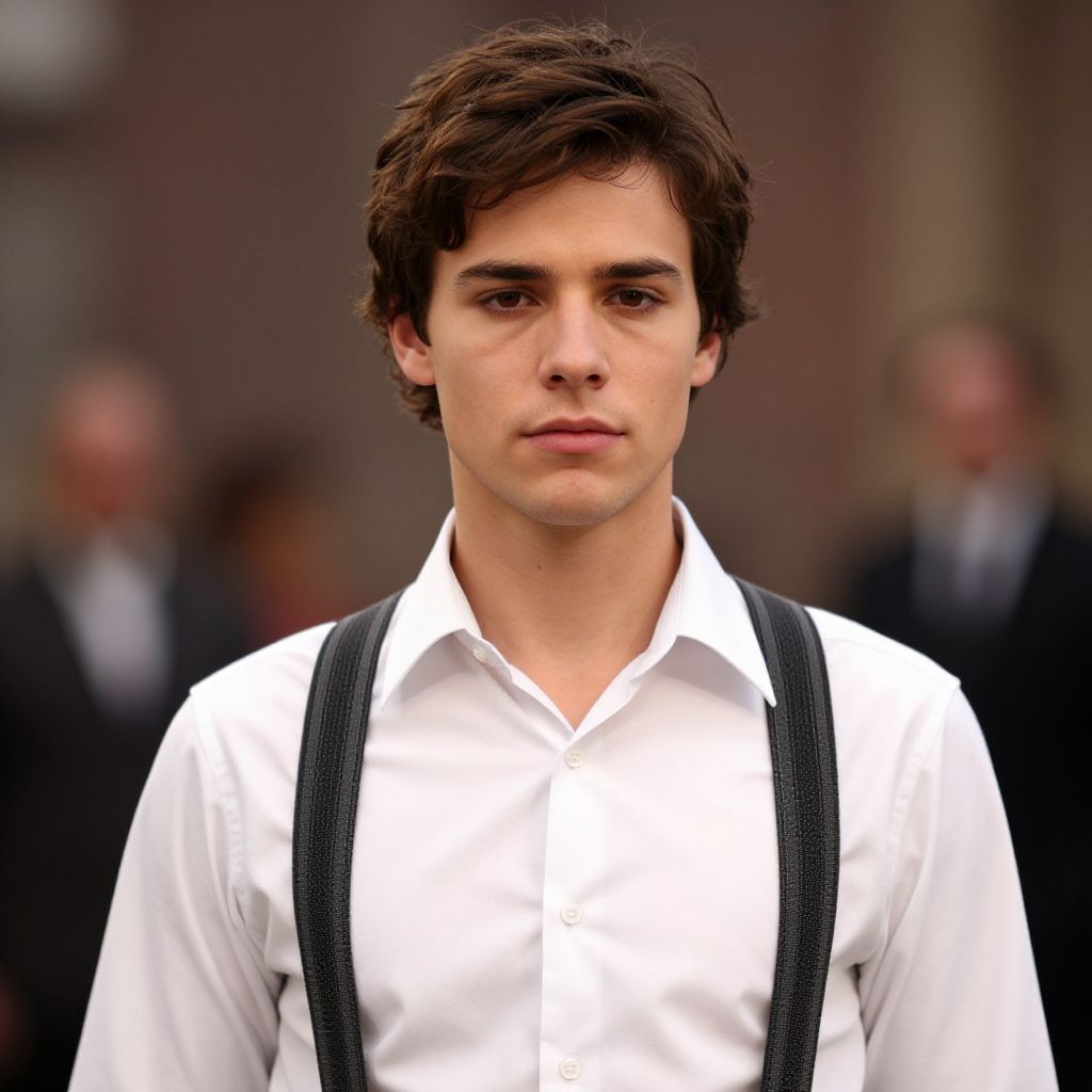 "edward scissorhands costume, solo, realistic, male focus, 1boy, suspenders, looking at viewer, upper body, brown hair, shirt, blurry, blurry background, closed mouth, short hair, lips Realistic photo of casual sexy person with pretty face"