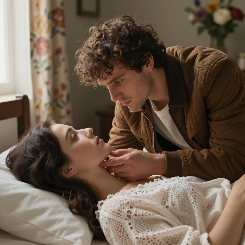 Two people lying on a bed, looking at each other. The woman with dark curly hair and a black shirt lies on the left, looking downward. The man with brown curly hair and a checkered shirt lies on the right, looking upward. Soft lighting, beige pillows in the background.