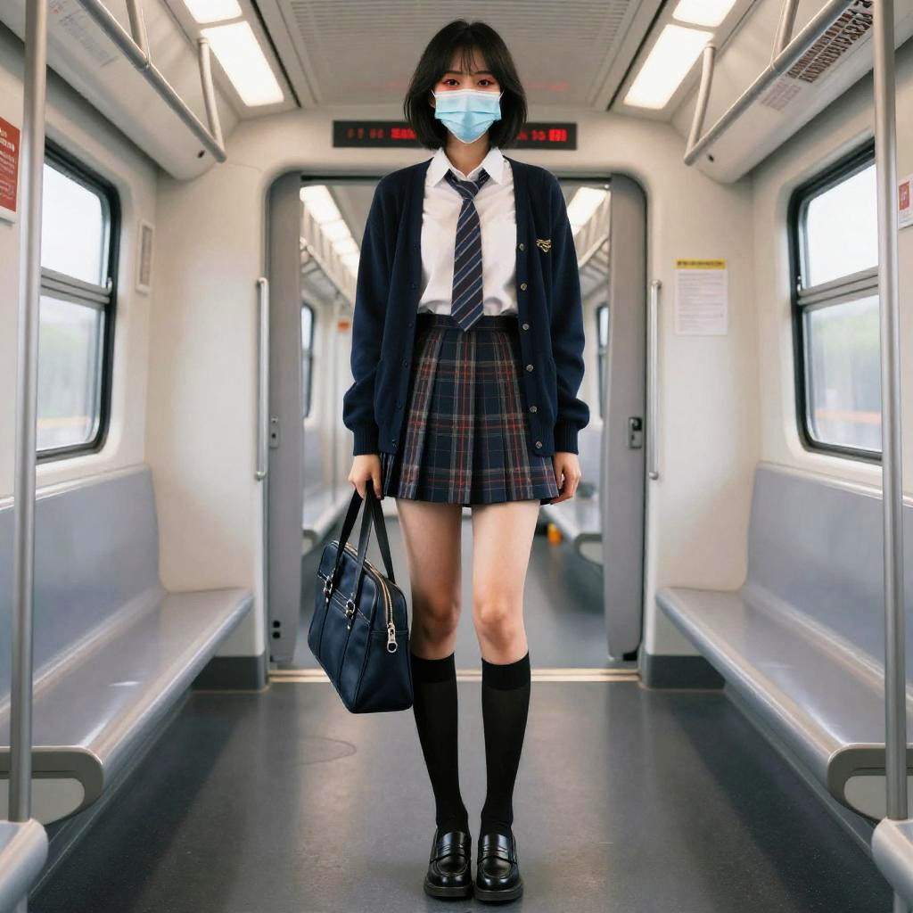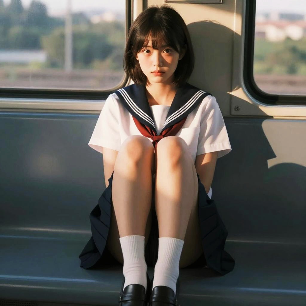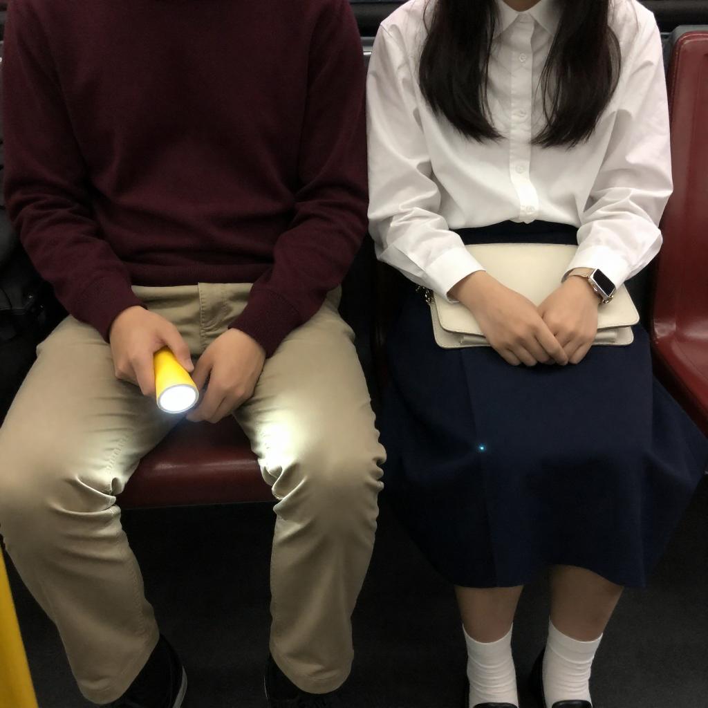 Two people sitting on a red bus seat. Left person wears maroon sweater, beige pants, holding yellow flashlight. Right person wears white shirt, navy skirt, white socks, black shoes, with white bag on lap. Dim lighting.