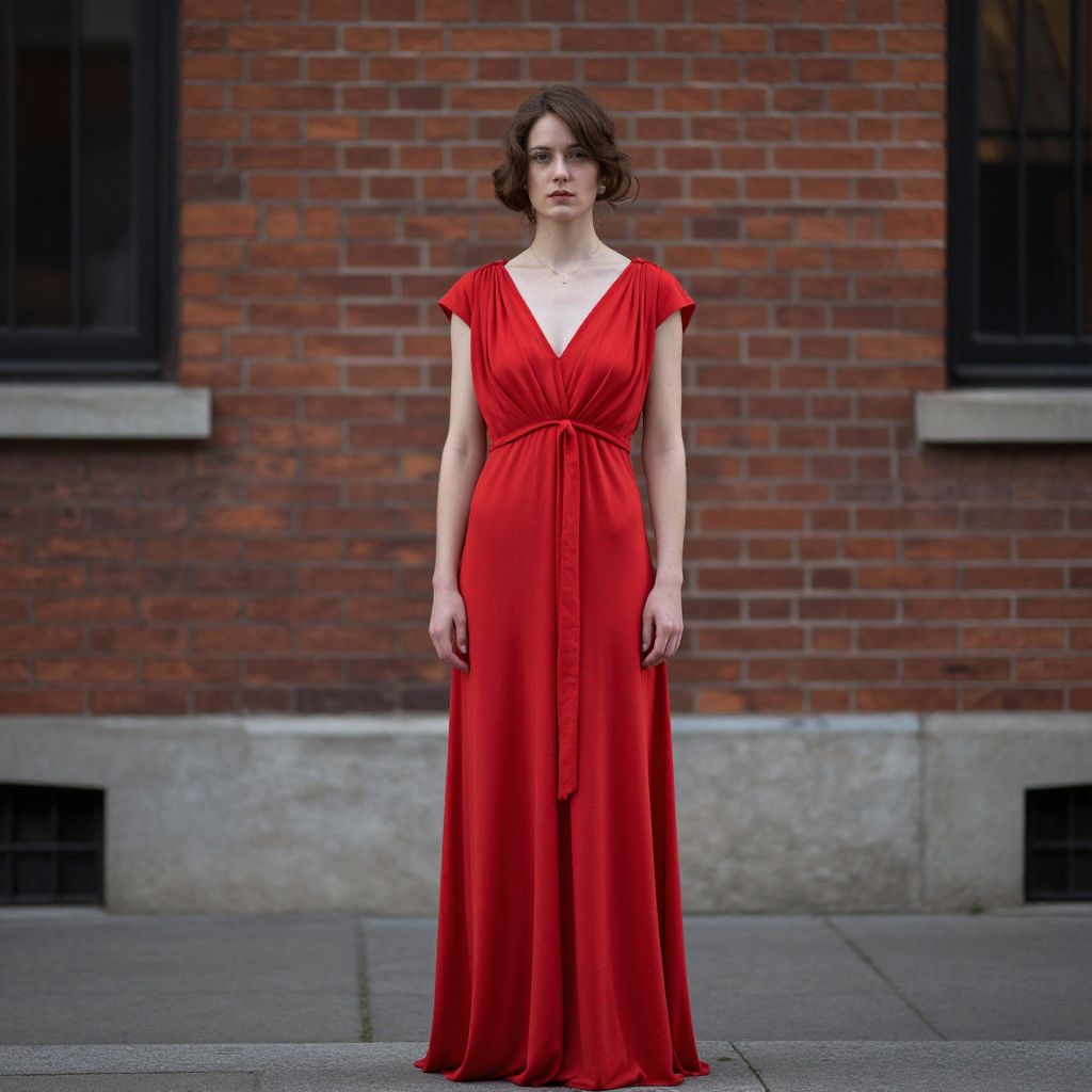 Red 1910s Dress, woman in red dress standing in front of brick building