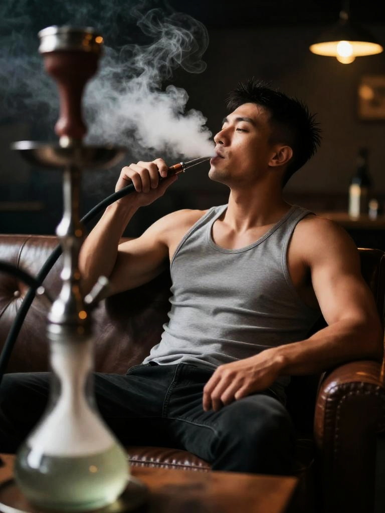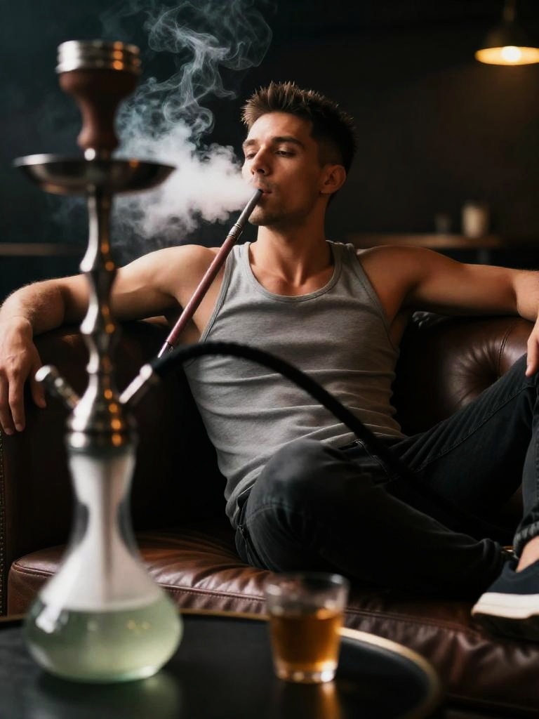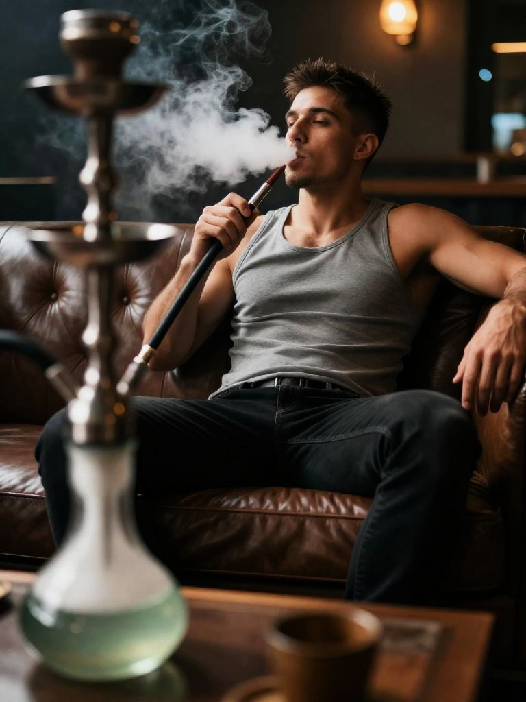 Man smoking shisha, adult man reclining on a leather sofa in a dim lounge, athletic man with short spiky hair and clean-shaven face wearing grey tank top and black jeans, holding the hookah hose close to his mouth as he exhales a thick cloud of smoke, large modern hookah with tinted glass base prominently blurred in the foreground, low depth of field, atmospheric shadows and soft warm highlights, cinematic lifestyle photograph, ultra realistic, high resolution