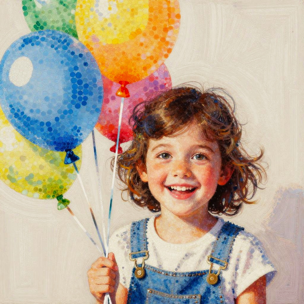 Cheerful Child with Balloons Pointillism