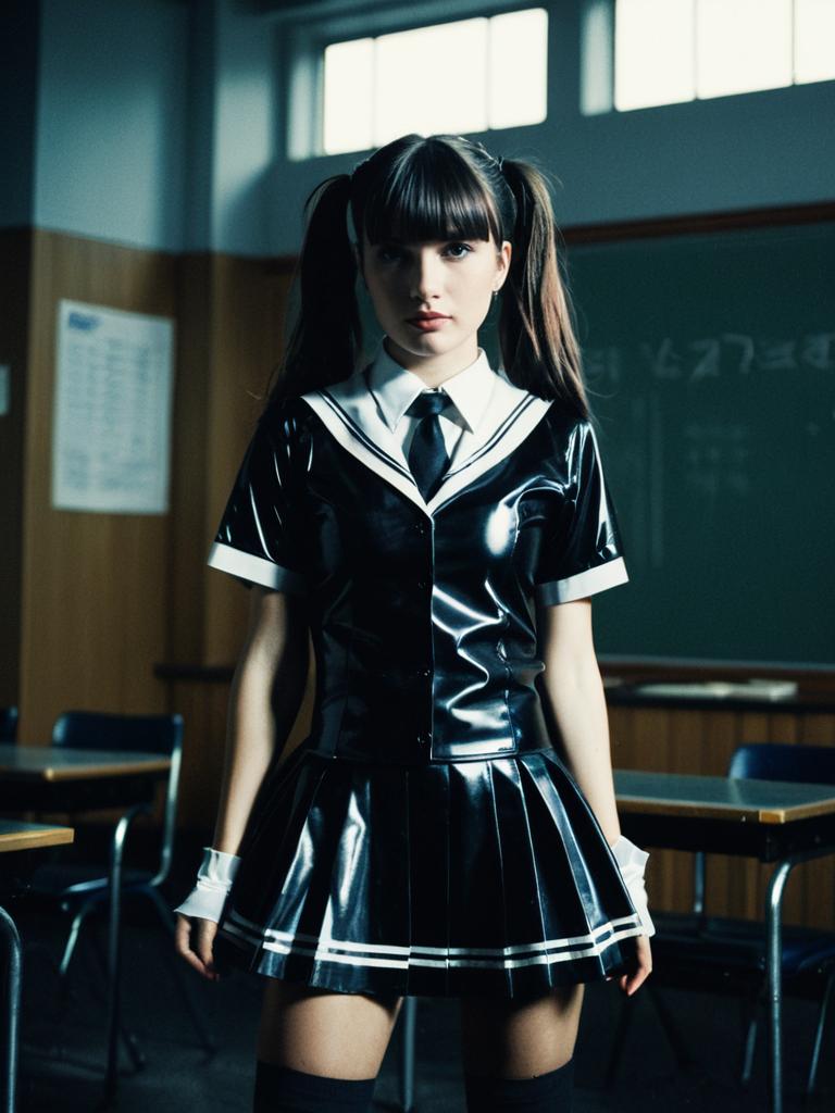 Woman in Latex Schoolgirl Costume, waist-up editorial portrait, photorealistic tones