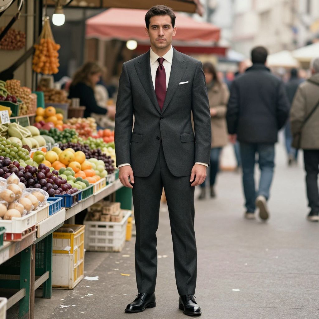 A man, dark slate grey suit, ivory dress shirt, burgundy silk tie, sleek black derby shoes, modern cut trousers, vibrant stalls, colorful produce, bustling crowds, vintage photo style, confident expression. Man has masculine face and piercing eyes