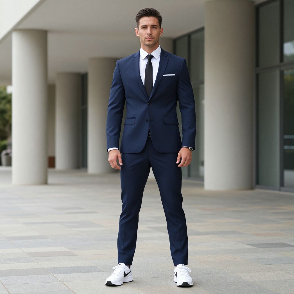 Photograph of a handsome, dark-haired man in a navy suit, white shirt, black tie, and white sneakers, standing confidently in a modern,