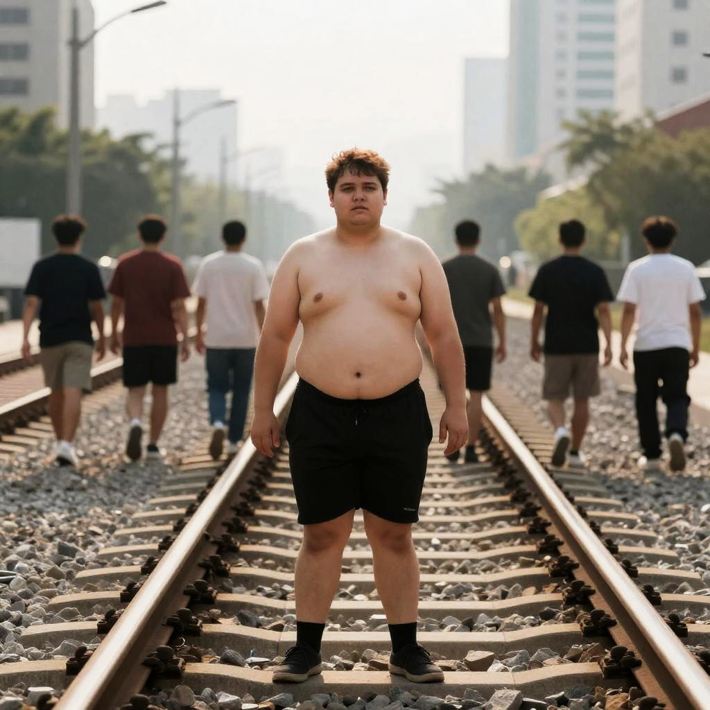 Shirtless, overweight man with short brown hair in black shorts and black socks stands on a gravel train track. Six men walk away in the background, wearing various clothing. Urban setting with tall buildings and streetlights. Sunlight creates a hazy effect.