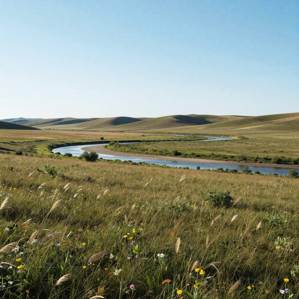 Espaces serene natural landscape with vast open fields, gentle rolling hills under a clear blue sky, scattered wildflowers swaying in the breeze, a winding river reflecting sunlight, soft shadows creating a peaceful and expansive feel, photorealistic style.