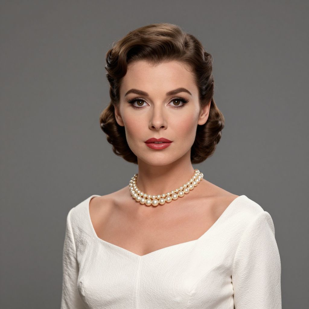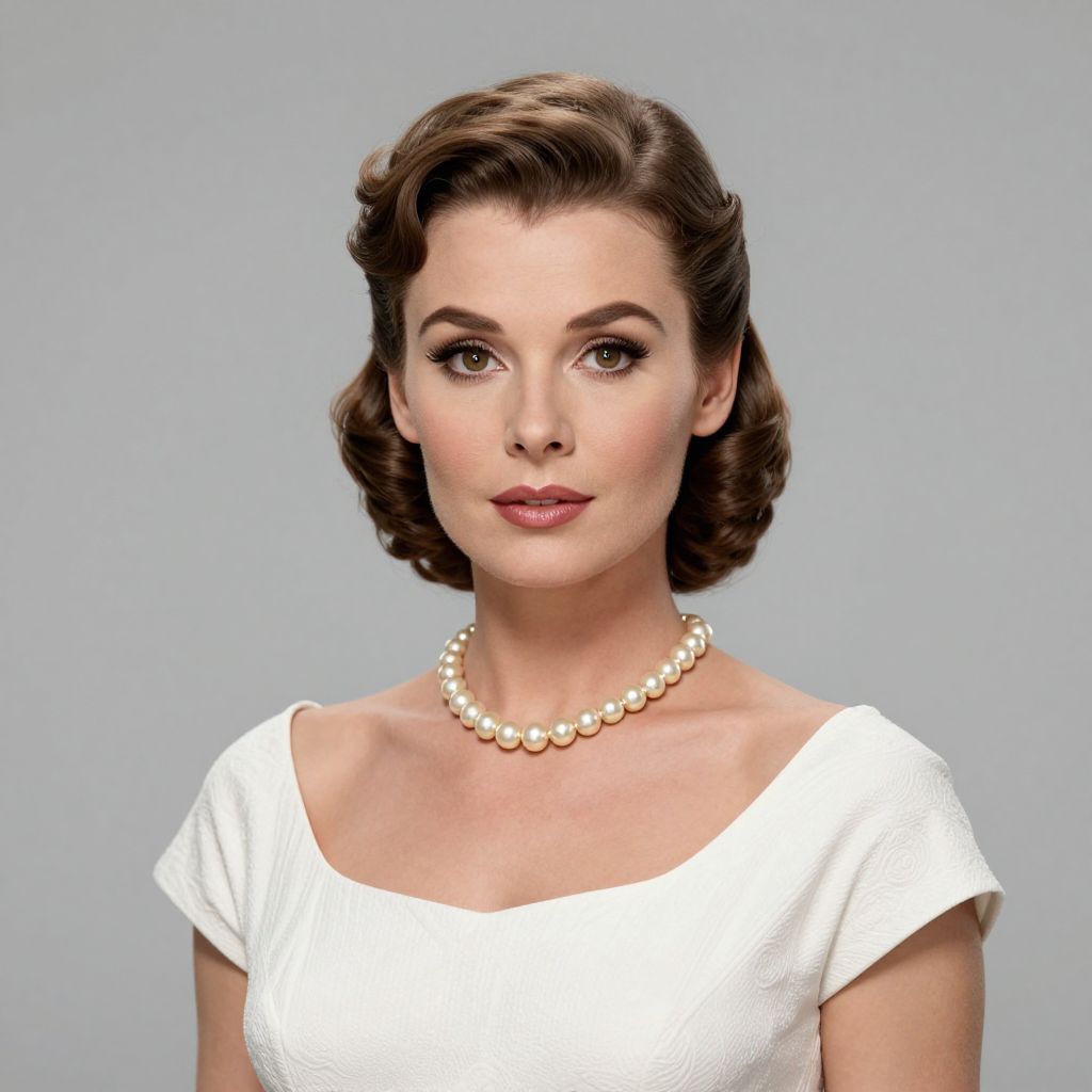 A high-definition 3D-rendered portrait of a woman with vintage styling, featuring a classic pearl necklace and a retro-inspired white dress, evoking the timeless elegance reminiscent of Grace Kelly.
