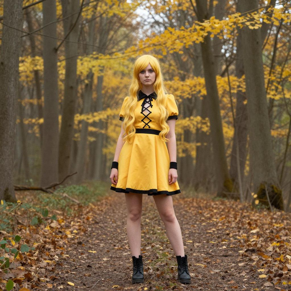 Photograph of a young woman with blue wavy hair standing on a forest path during autumn. She is wearing a yellow long-sleeve shirt under a green dress with blue trim and buttons, surrounded by tall trees with yellow leaves and yellow flowers on the left. The scene is lit with natural daylight and features a slightly blurred background with a path leading into the distance.