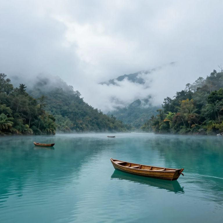 Photograph of a serene lake surrounded by mist-covered, lush, green forested hills. Three wooden rowboats float on the calm, turquoise water, with one boat closest to the foreground, slightly to the right. The background features dense trees shrouded in mist, creating a peaceful, almost ethereal atmosphere. The sky is overcast, with soft light filtering through the clouds, enhancing the tranquil mood of the scene. The water reflects the greenery and mist, adding to the serene and untouched natural beauty.