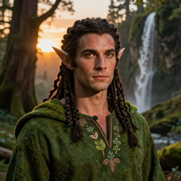 Photograph of a fantasy character, a male elf with pointed ears, dark brown, curly dreadlocks, and tan skin. He wears a green, textured tunic with intricate leaf embroidery on the chest. The background features a sunlit forest with tall trees and a cascading waterfall. The elf's expression is calm and focused, with a slight smile. The warm, golden sunset light filters through the trees, creating a magical, serene atmosphere. The image has a realistic, digital art style with rich colors and detailed textures.