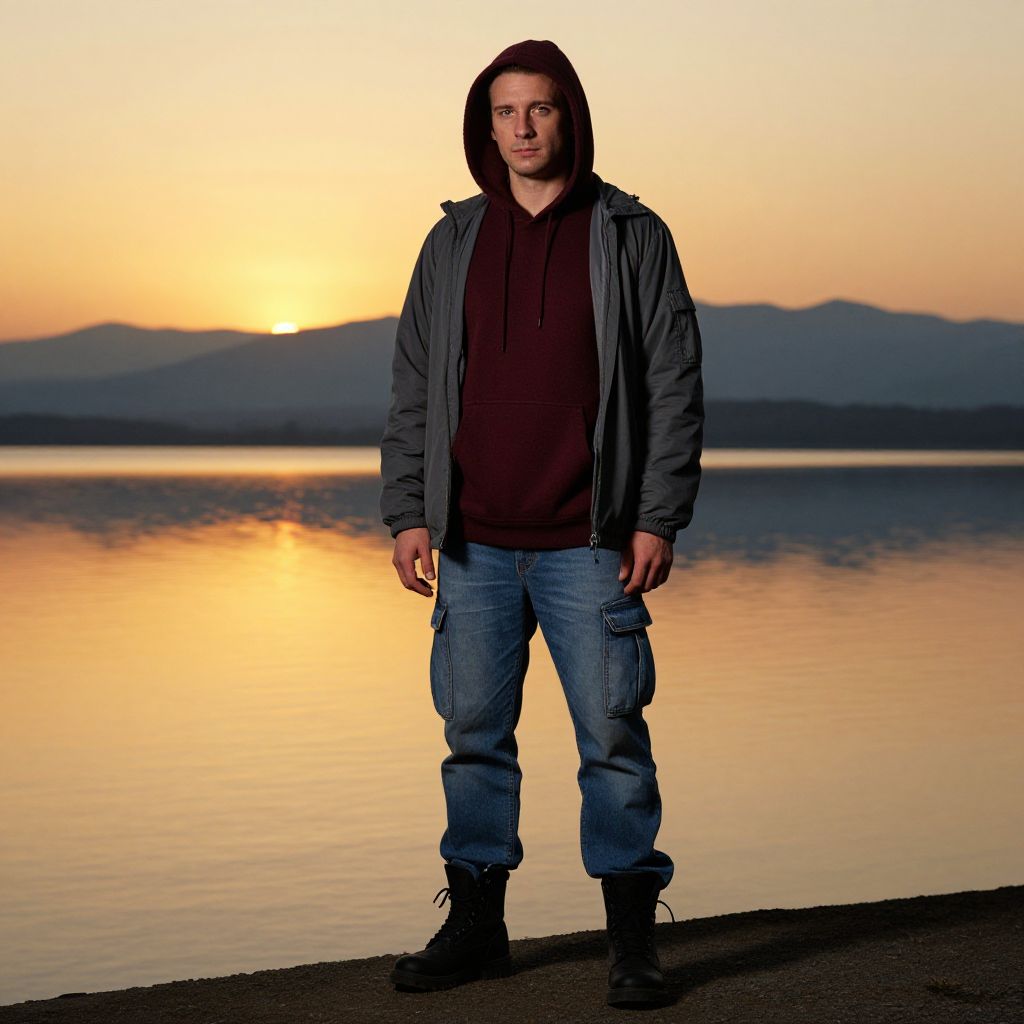 Photograph of a Caucasian man standing on a lakeshore at sunset. He has fair skin, short brown hair, and is wearing a dark gray hooded jacket over a maroon hoodie, blue jeans with multiple pockets, and black boots. The background features a calm lake reflecting the orange and yellow hues of the sunset, with distant, silhouetted mountains. The man stands with a neutral expression, his hands by his sides. The image has a soft, warm lighting, highlighting the serene natural setting.