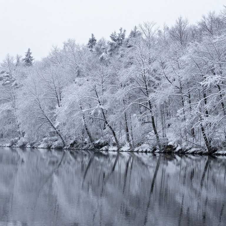 Serenity whispers through the still winter air, as snow-draped trees mirror their quiet resilience in the calm waters below, inviting introspection amidst nature’s eternal embrace.