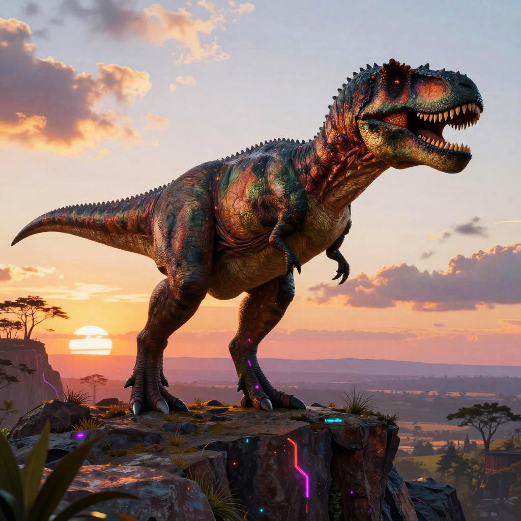 Dinosaur AI art depicting a majestic T-Rex standing atop a rocky cliff at sunset, vibrant colors blending prehistoric landscapes with futuristic neon accents, intricate digital brushstrokes showing scales and texture in stunning detail.