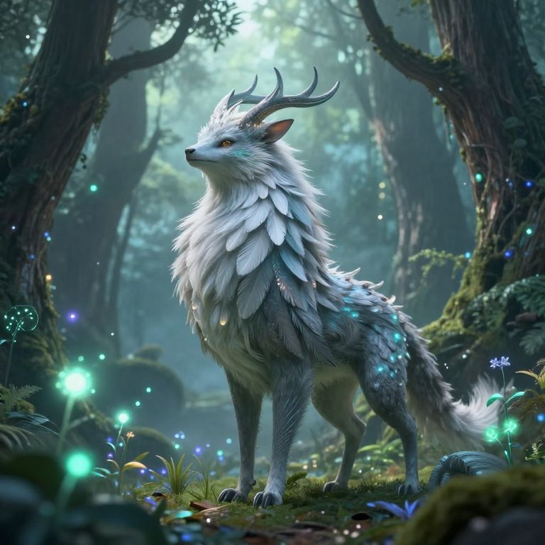 Fricle depicted as a mythical creature made of light and shadow, roaming a vibrant fantasy meadow full of strange flora and colorful mushrooms, painterly style with brushstroke textures, rich colors, and an enchanted forest ambiance.