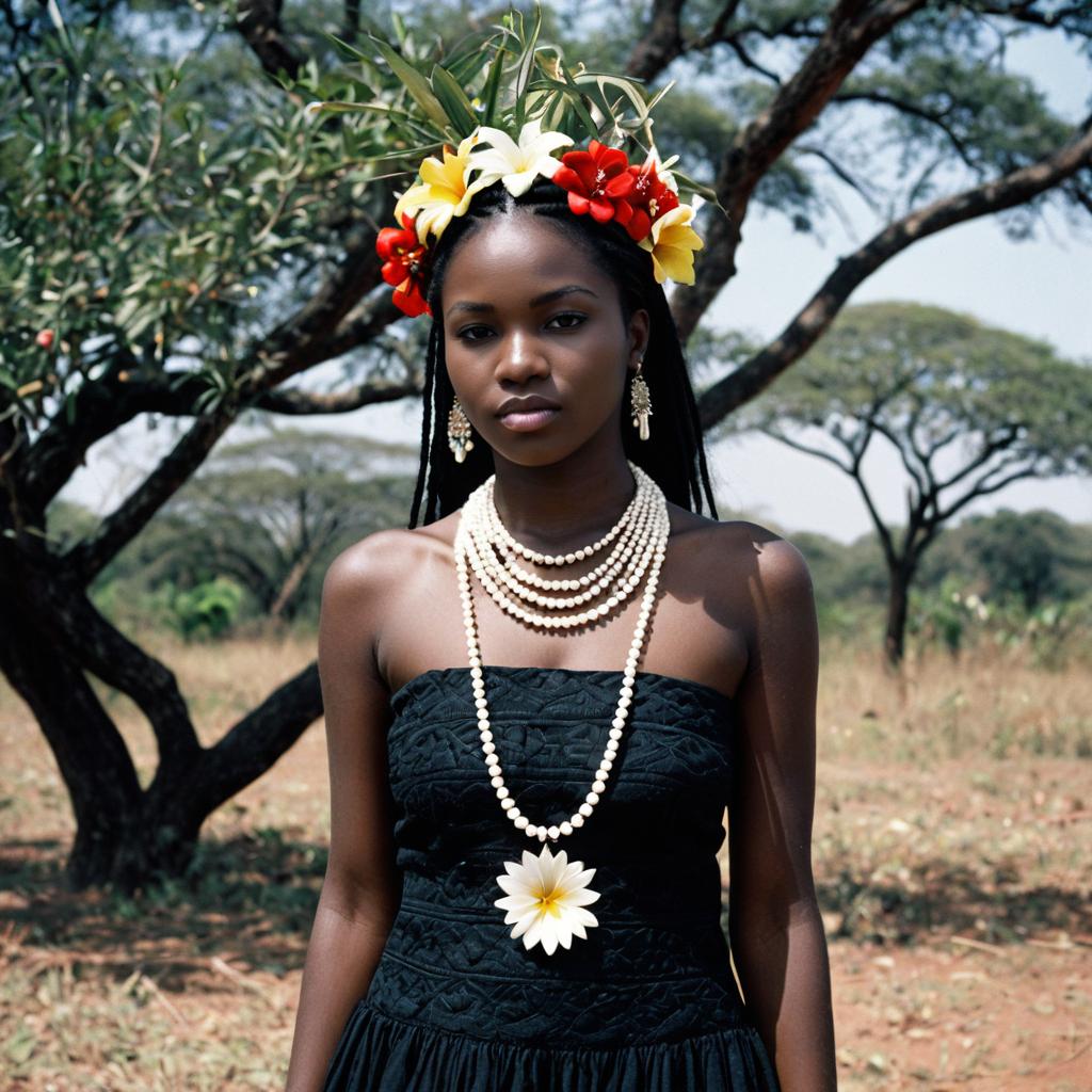 Zimbabwe national costume,1girl, solo, jewelry, dress, necklace, tree, realistic, flower, black hair, outdoors, hair ornament, hair flower, bare shoulders