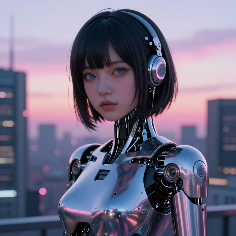 A futuristic interpretation of Hayase as an android with sleek metallic features, set against a backdrop of a high-tech metropolis skyline at dusk, vibrant pastel colors blending with dark shadows, expressive eyes glowing softly, cybernetic and ethereal blend.