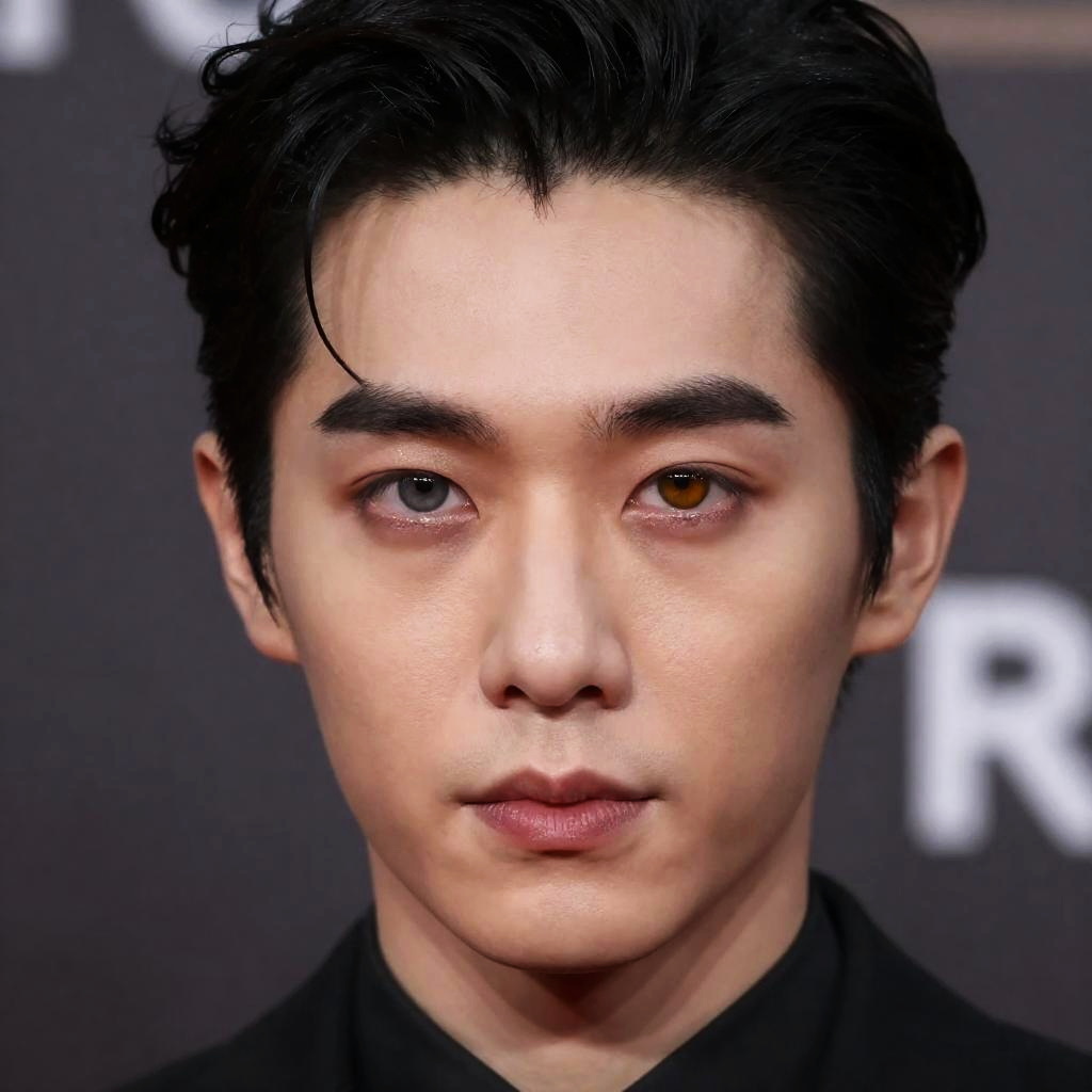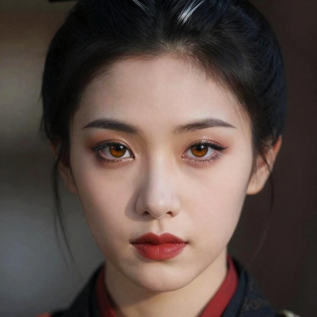 A wise old man, with a grey beard and wise brown eyes, wearing exquisite makeup, featuring shimmering eyeshadow and bold lipstick, captured in a stunning facial close-up.