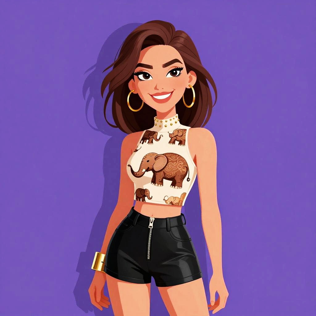 Digital illustration of a smiling young woman with brown hair, wearing a red elephant tank top, blue jeans, and hoop earrings, against a purple background.