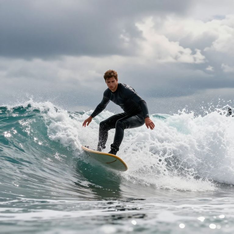 Photograph of a young man surfing on a medium-sized wave. He has light brown, wavy hair and is wearing a black, full-body wetsuit. His posture is balanced, with knees slightly bent and arms out for stability. The wave is cresting with white foam, and the water is a mix of deep blue and green. The sky above is overcast with dense, gray clouds, casting a diffused light over the scene. The surfboard is yellow with a white edge, visible beneath his feet. The overall composition emphasizes action and motion, with the vibrant colors of the wave contrasting against the muted sky.