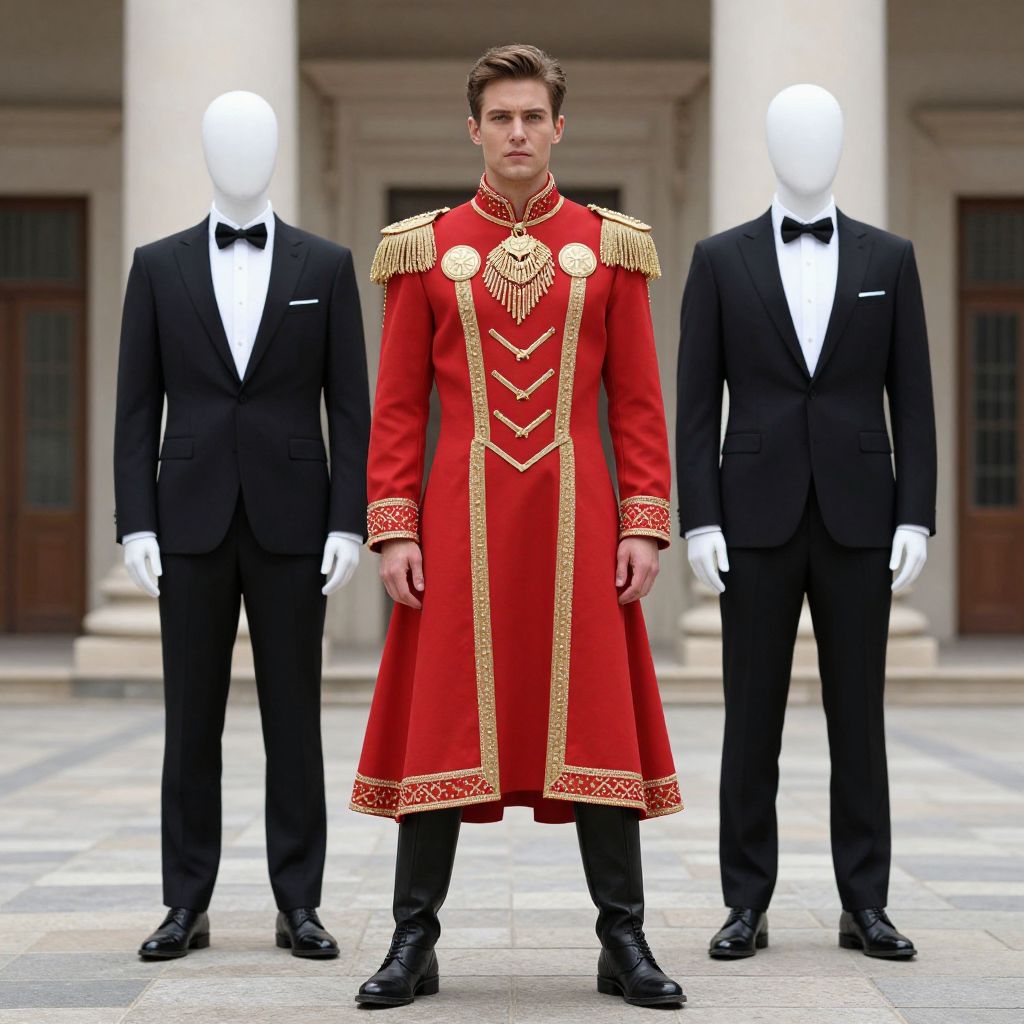 Fashion Plates Costume, man in a red and gold costume standing in front of a building