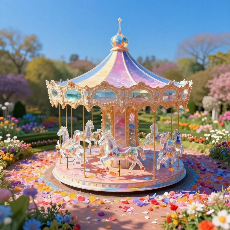 An aerial perspective showcases an impressionistic garden in its prime, with petals merging into abstract bursts of color against a rich blue sky. At the garden's heart, a whimsical carousel features horses constructed from fragile glass sculptures, their forms capturing and dispersing sunlight similarly to prisms, generating captivating patterns across the surrounding vista. The soft, blurred atmosphere conveys a sense of marvel and enchantment, while the juxtaposition of natural splendor and fantastical mechanics creates an emotional spectrum ranging from serenity to astonishment, beckoning viewers into a surreal world where reality and imagination seamlessly blend in a harmonious embrace.