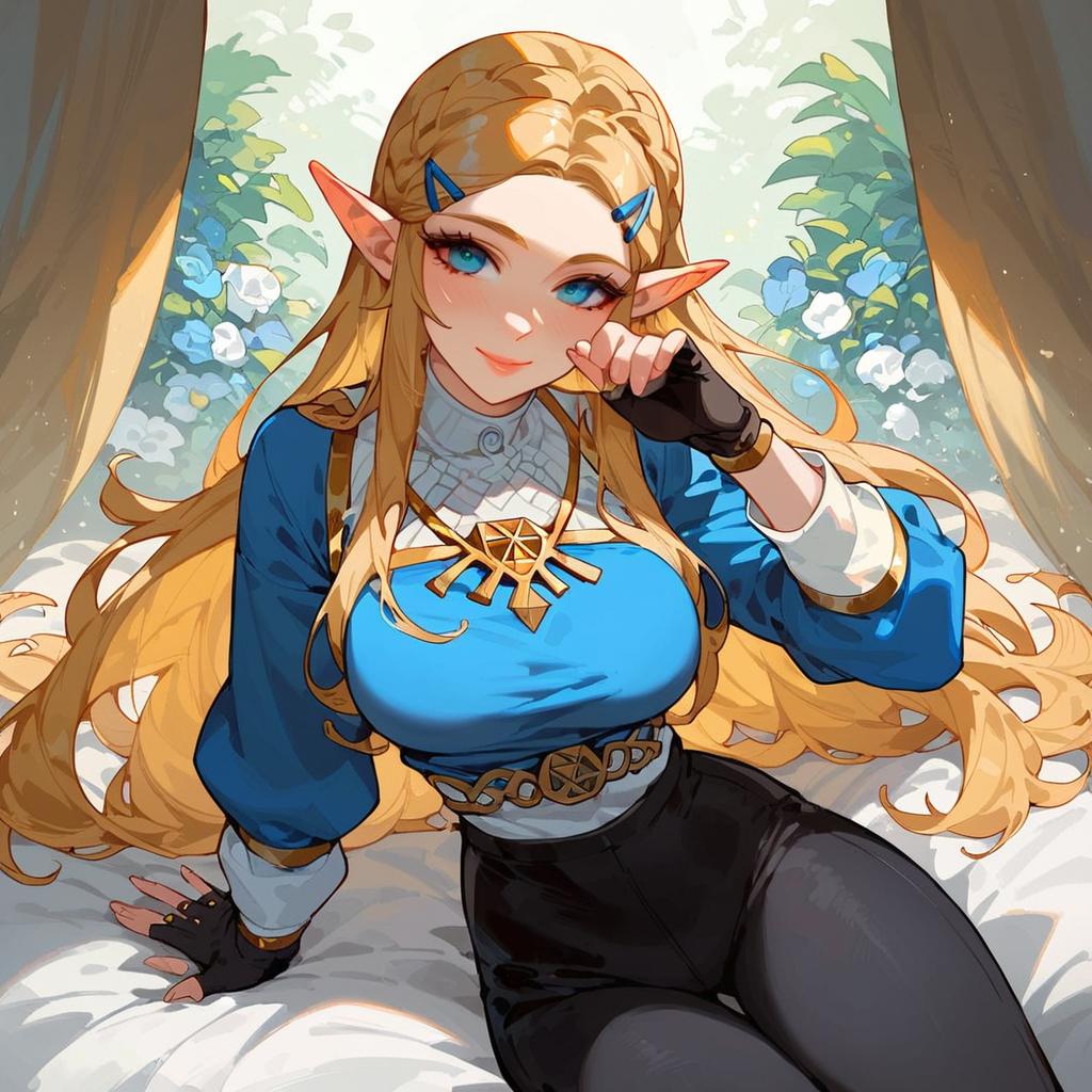 Score_9, score_8_up, score_7_up, score_6_up solo, princess zelda, legend of zelda: breath of the wild, short hair, leggings, thick thighs, field, sitting, hugging own legs, slight smile, boots, wind, flowers, looking at viewer