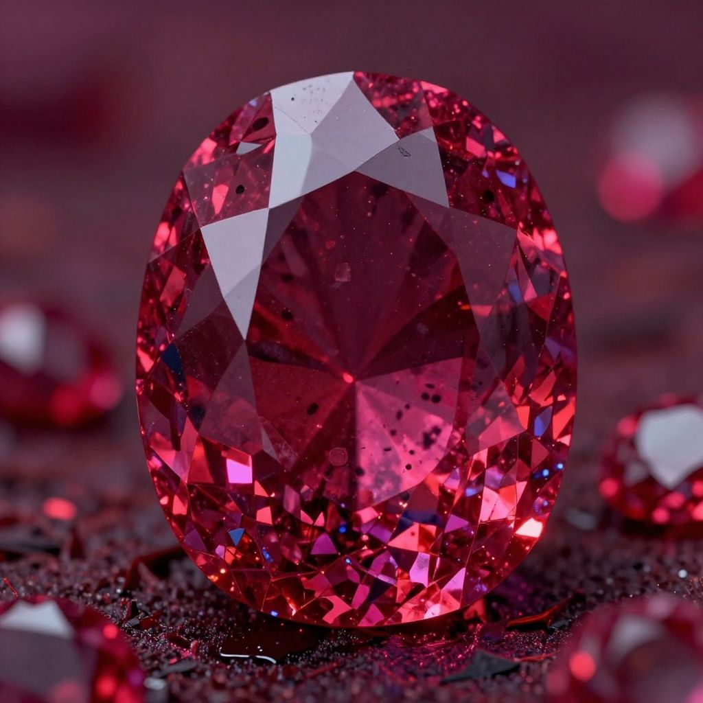 Photograph of a brilliant, deep red, faceted gemstone, reflecting light, set against a dark, textured background with scattered smaller red gems.