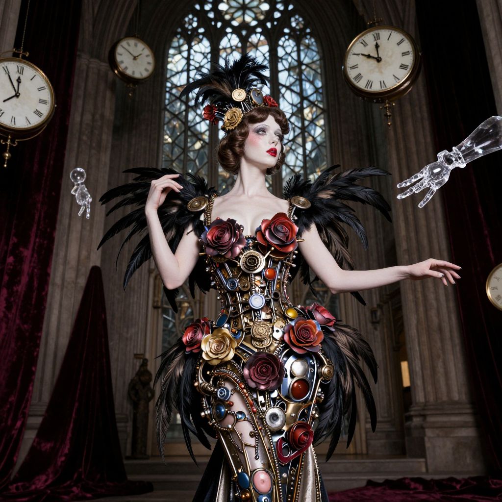 A vision of a 1930s surrealist muse in a lavish woman costume, standing beneath a cathedral of twisted glass and velvet shadows. She has an elegant, porcelain face with high cheekbones and a subtle smudge of crimson lipstick, wearing a gown made of interlocking mechanical roses and feathers that seem to pulse with life. Abstract accessories like suspended clocks, floating clocks, and crystal hands float around her.. The woman has big tits and cute face