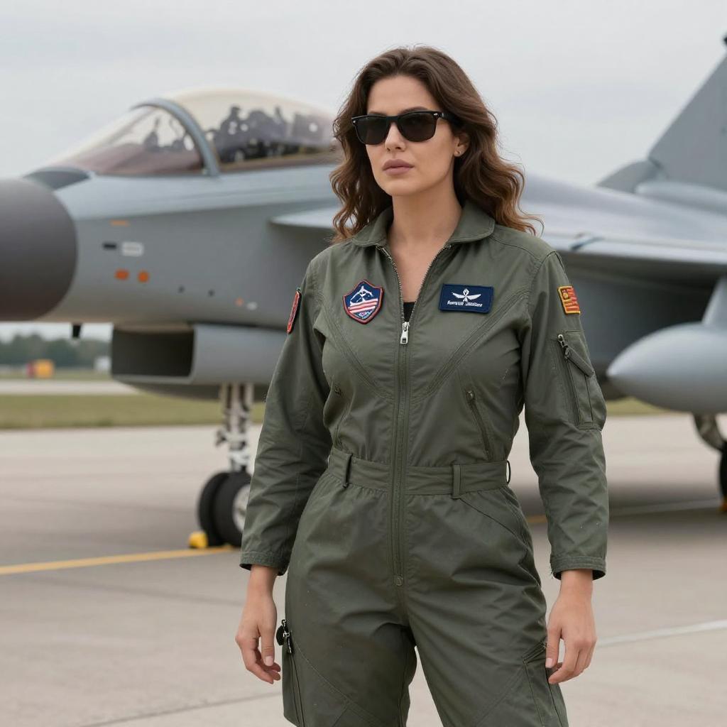 Photograph of a curvy woman with long, wavy brown hair and sunglasses standing in front of a military jet. She's wearing a tight, olive green flight suit with multiple patches on the sleeves and chest, and black straps across her chest and waist. The jet's nose is in the background, slightly out of focus. The ground is gravelly, and the sky is overcast. She looks confident and sexy.