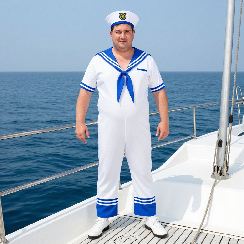 Photorealistic image of a plus-sized man in white sailor uniform with blue accents, standing on a sailboat deck, facing the calm blue ocean under