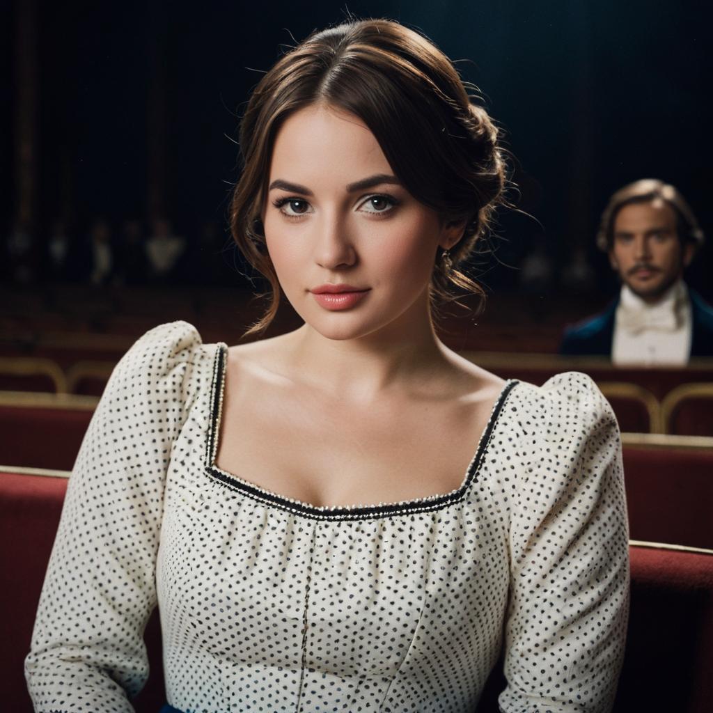 Portrait of a young woman with brown hair and brown eyes wearing a vintage long-sleeved white dress with black polka dots, seated in a theater. The background features red velvet seats and a man dressed in formal attire, slightly out of focus.