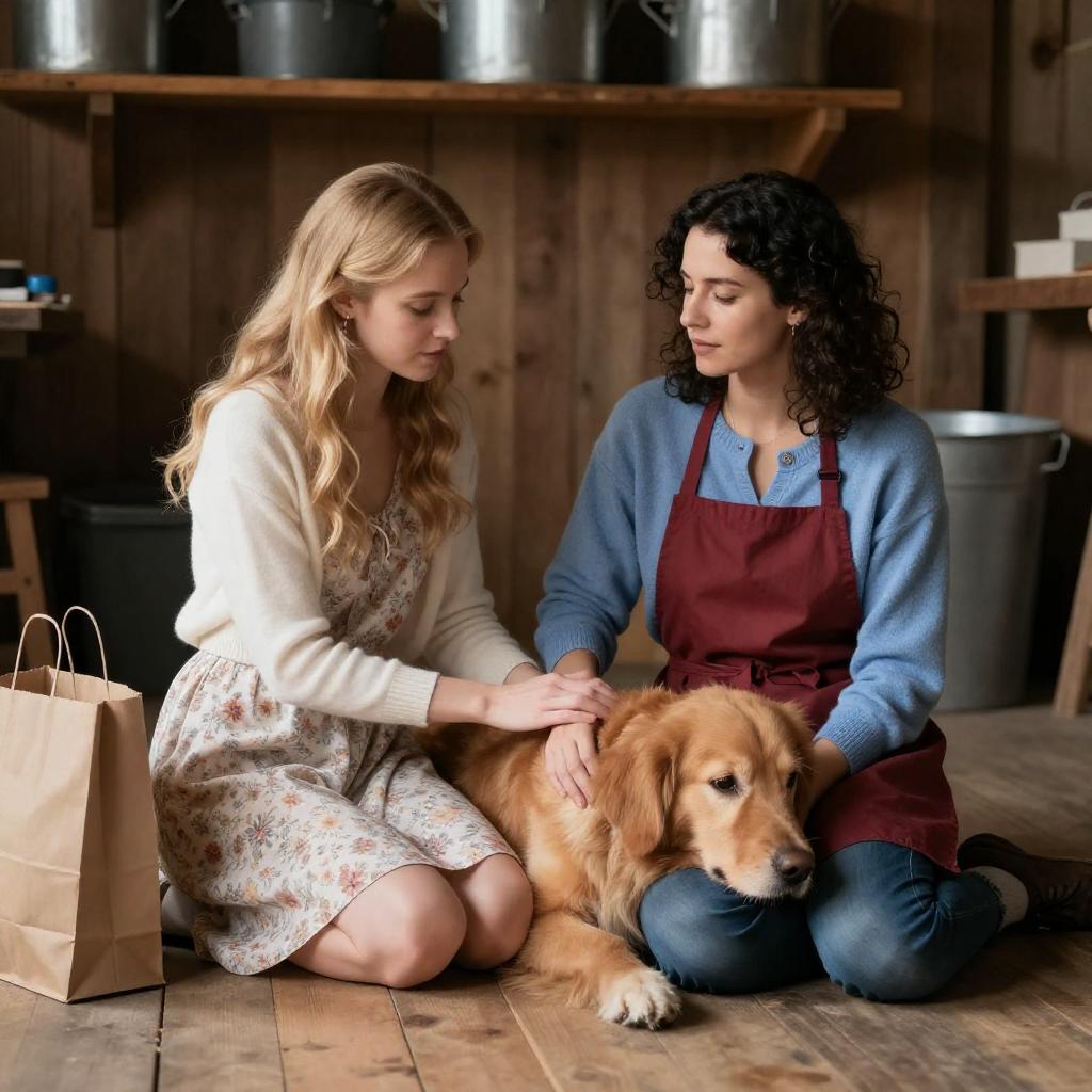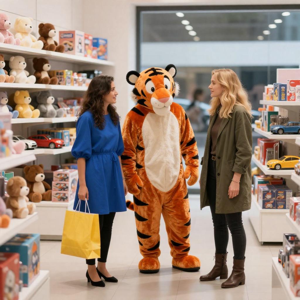 Photograph of a brightly lit toy store. Two people: a woman in a blue dress, black top, and a person in an orange tiger costume. Another woman with blonde hair, green coat, and brown boots. Stuffed animals, toys, model cars, and shelves filled with merchandise in the background. Both women standing, one with a shopping bag. Tiger costume person leaning towards the woman in blue dress. Store window with visible reflections.