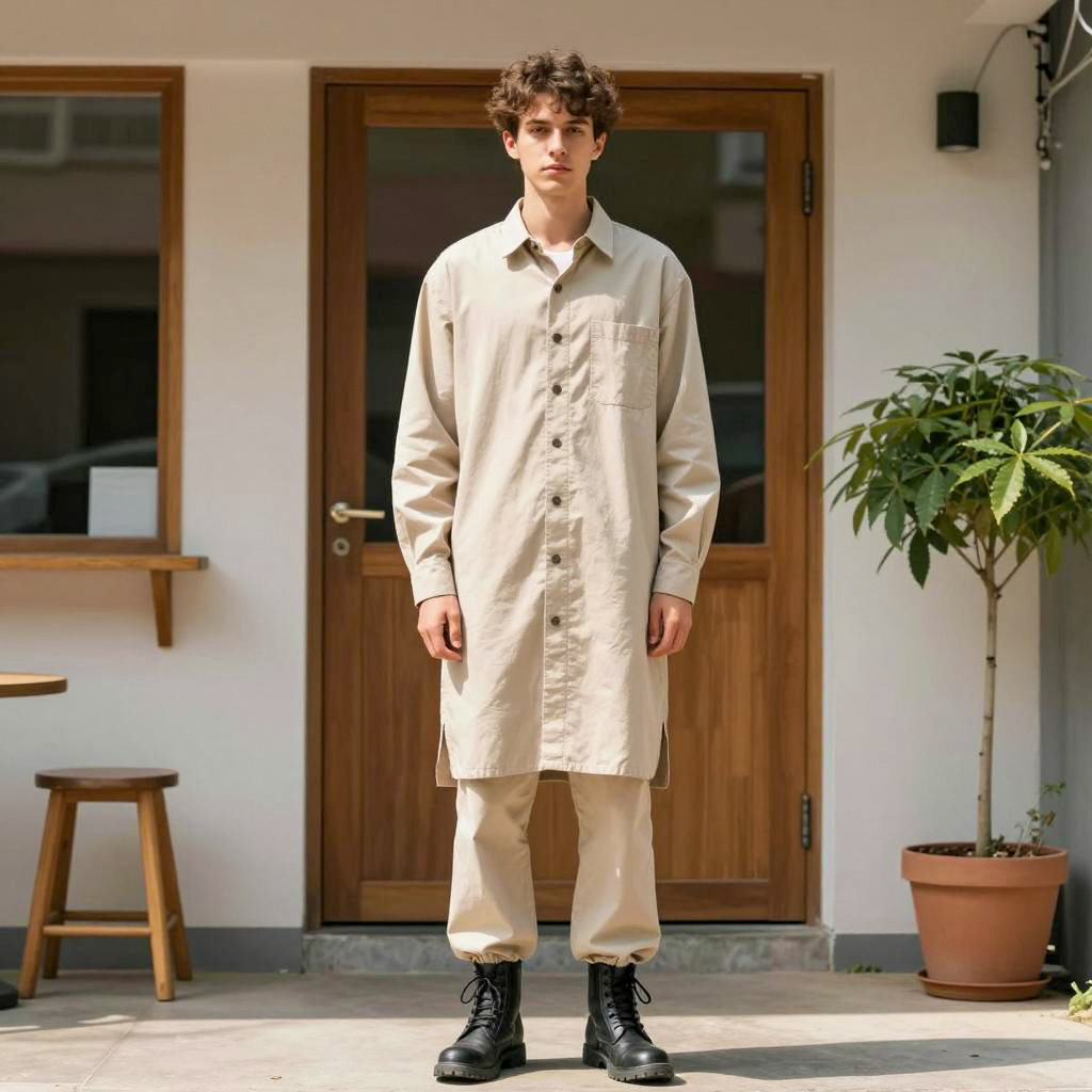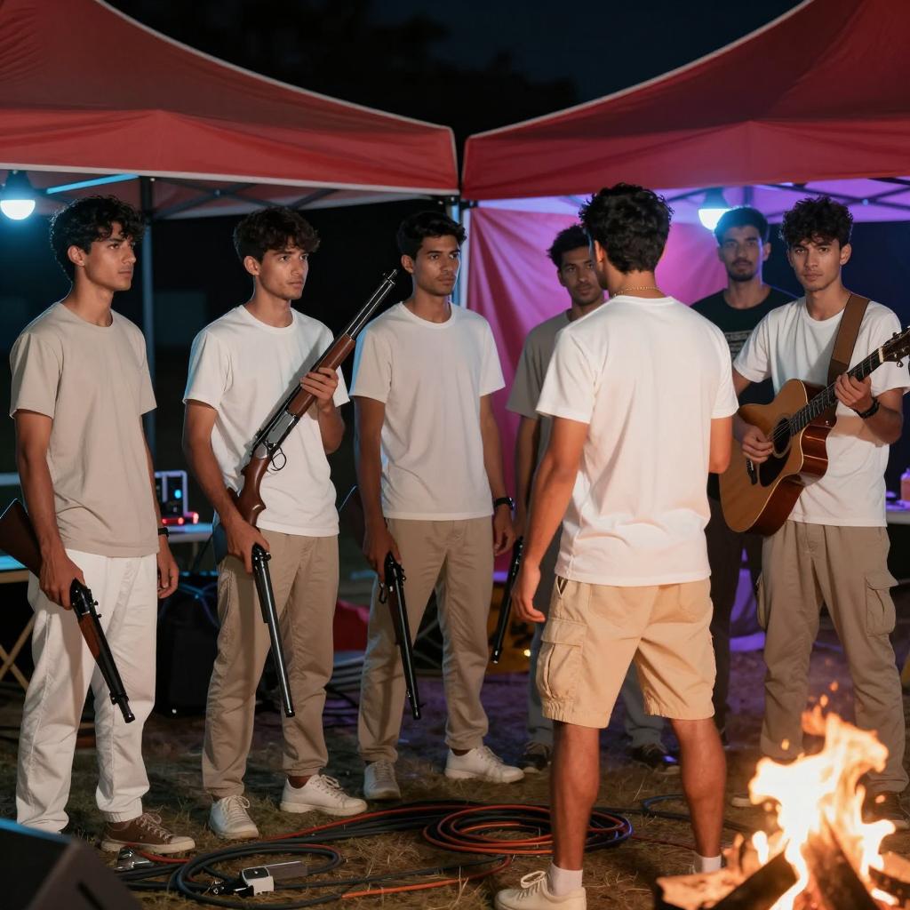 Seven men standing in a row. Six wear blue or gray jackets with white cargo pants, one wears a brown jacket. One man holds a rifle, another holds a gas mask. Third from left has dark skin. All have curly or short hair. Light blue background. Casual, military-style clothing. Intense facial expressions. Six men on left, one on right.
