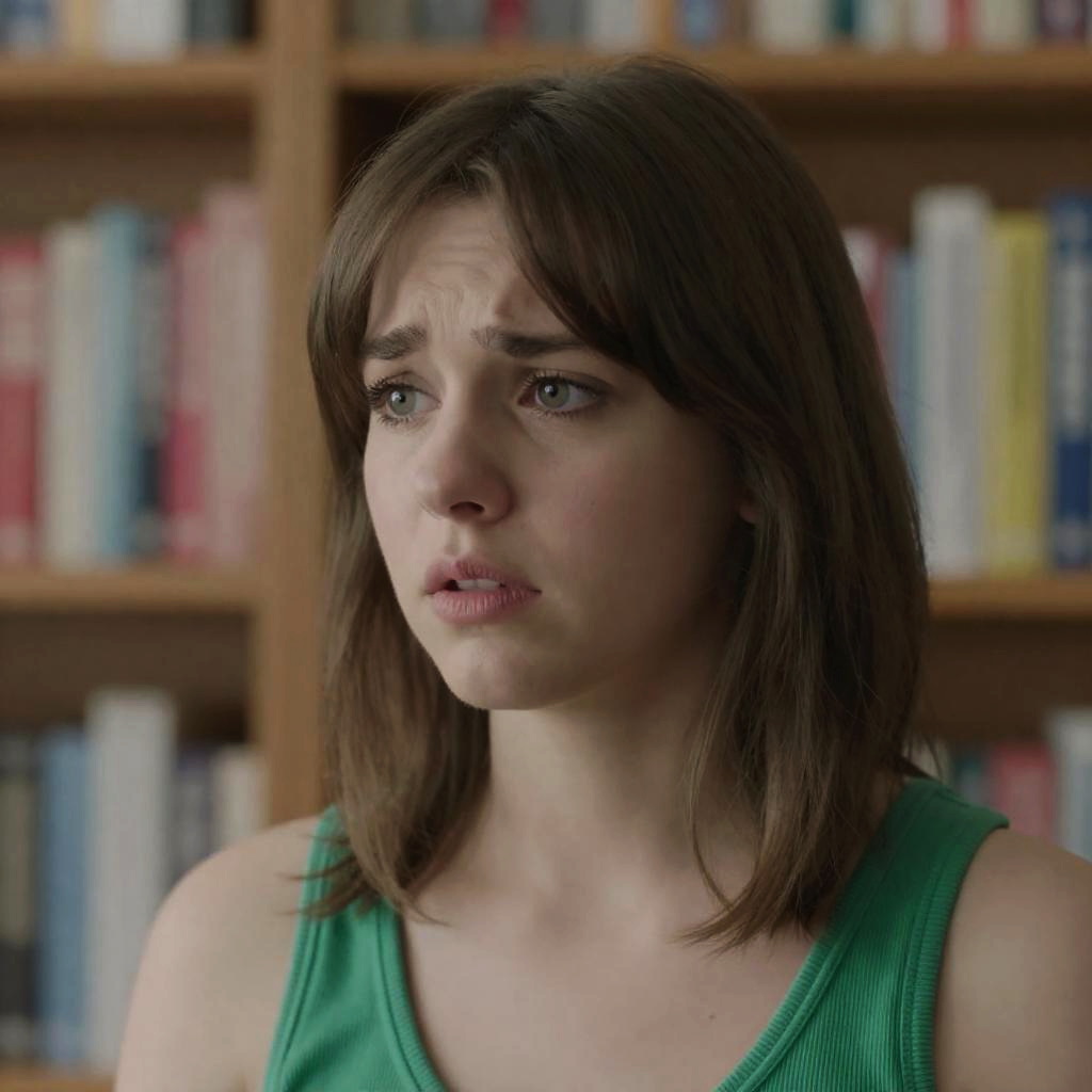 Young girl with light brown hair, pink hair clip, and white shirt, sitting on floral-patterned couch, looking worried. Background: patterned curtains, wooden door, brown jacket on couch. Realistic photograph.