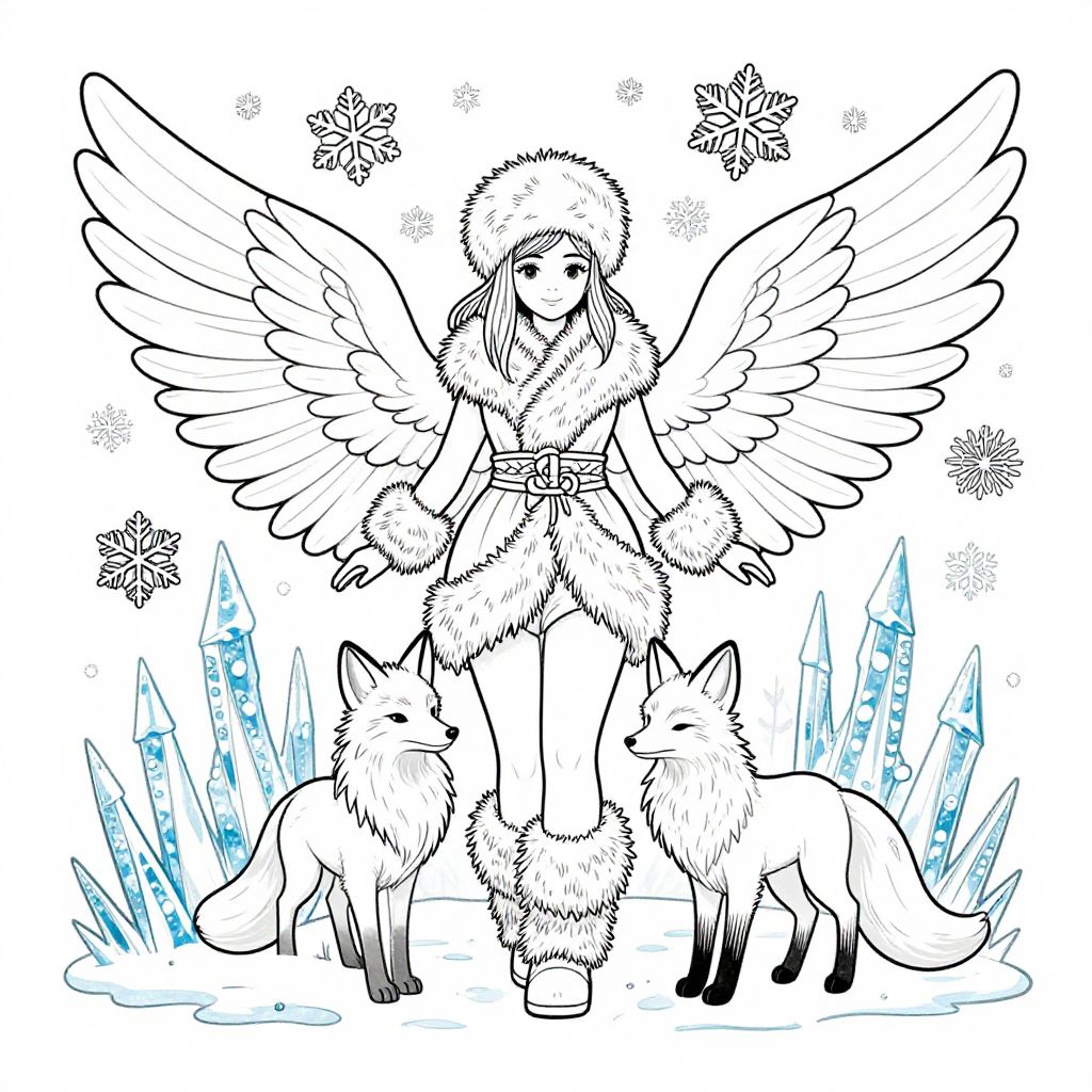 A black-and-white digital line drawing depicts an angelic figure with large feathered wings, dressed in a fur-trimmed outfit, standing between two foxes. The angel has a halo and wears a belt with a fur wrap. Snowflakes and blue crystal formations surround the scene, adding a winter feel. The foxes, one on each side, have detailed fur textures. The angel's wings are expansive, and the overall style is whimsical and fantasy-themed. The background is minimal, focusing on the angel and foxes.
