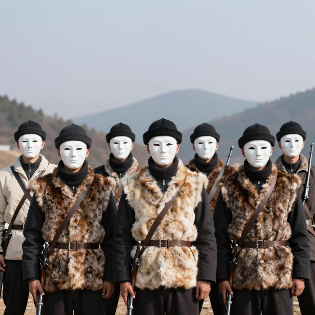Multiple male figures with white-painted masks and black clothing stand in a mirror-lined room. Their faces are in profile, showing neutral expressions. The figures are in a row, with reflections repeating the sequence. Background includes hanging spherical lights.